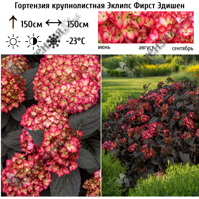 Гортензия крупнолистная 'Эклипс Фирст Эдишен' –  настоящая темнолистная гортензия, высотой до 150 см. Листья сохраняют свой насыщенный темно-фиолетовый цвет в течение всего лета, даже в теплом климате. Гортензия Eclipse имеет округлую форму, которую можно сочетать с другими растениями. Сорт также отличается впечатляющими яркими малиново-красными или неоново-фиолетовыми цветками, которые цветут с конца весны до осени.