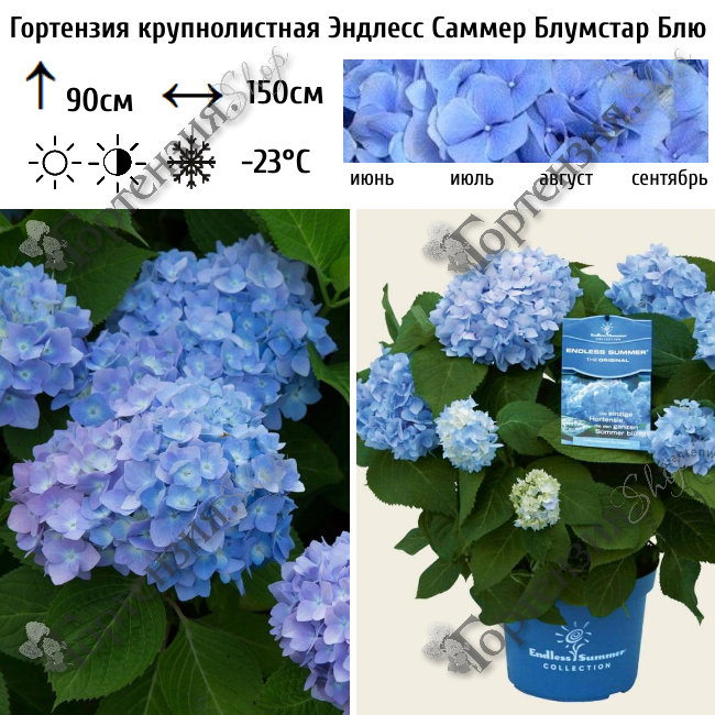 За способность цвести повторно сорт назвали Endless Summer Bloom Star. Endless Summer Bloom Star –гортензия крупнолистная, которая способна образовывать цветки на новых побегах этого года так же хорошо, как и на побегах прошлого года, и обладающая высокой зимостойкостью.  Если и пострадают почки на прошлогодней древесине, то все равно зацветут молодые побеги. Гортензия Endless Summer Bloom Star цветет красивыми, крупными шарообразными соцветиями диаметром 15-18 см, состоящими из стерильных цветов розового или синего цвета - в зависимости от кислотности почвы, в которой она растет. В щелочной почве она окрашена в розовый цвет, а в кислой с большим содержанием алюминия – в голубой. Побеги бордовые, прочные. Жилки и вены на листовой пластинке бордовые. Листья устойчивы к мучнистой росе. Взрослый куст гортензии может достичь 1 м в высоту. Для посадки подходит место с утренним солнцем и тенью в полдень с влажной и хорошо дренированной почвой. Подходит для выращивания в качестве отдельного растения, в группах, для большого контейнера или в смешанных посадках.