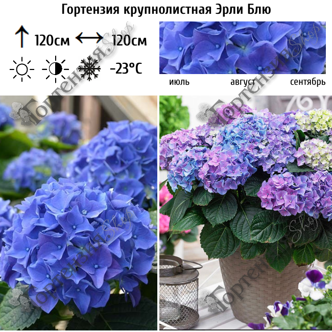 Гортензия крупнолистная Эрли Блю (Early Blue) - ремонтантный сорт, самый первый начинает радовать своими голубыми соцветиями, высотой до 120 см. Зацветает ремонтантная гортензия как на прошлогодних побегах, так и на побегах текущего года, образуя пышные шаровидные соцветия. Размер каждого из них может достигать 20-30 см. Окрас цветков варьируется от голубых до фиолетовых тонов (в зависимости от кислотности почвы), а цветение длится с июля по сентябрь.