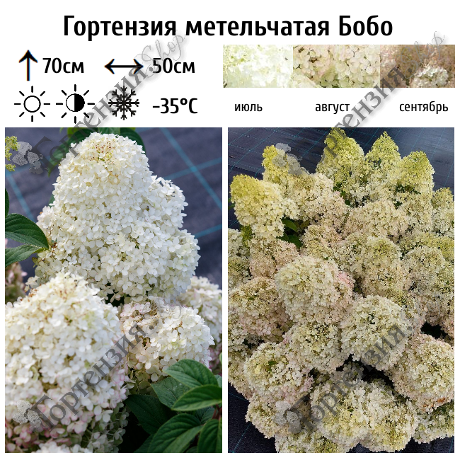 Гортензия метельчатая (Hydrangea paniculata) 'Бобо' - малышка высотой до 70 см. Листья тёмно-зелёные, поэтому на их фоне крупные, белоснеежные соцветия выглядят очень эффектно.С июля по сентябрь куст покрывается нежным цветущим облаком. Гортензия метельчатая Бобо так популярна ещё и благодаря своей отличной устойчивости не только к зимним морозам, но и к заморозкам, которые часто возникают в весеннее время.