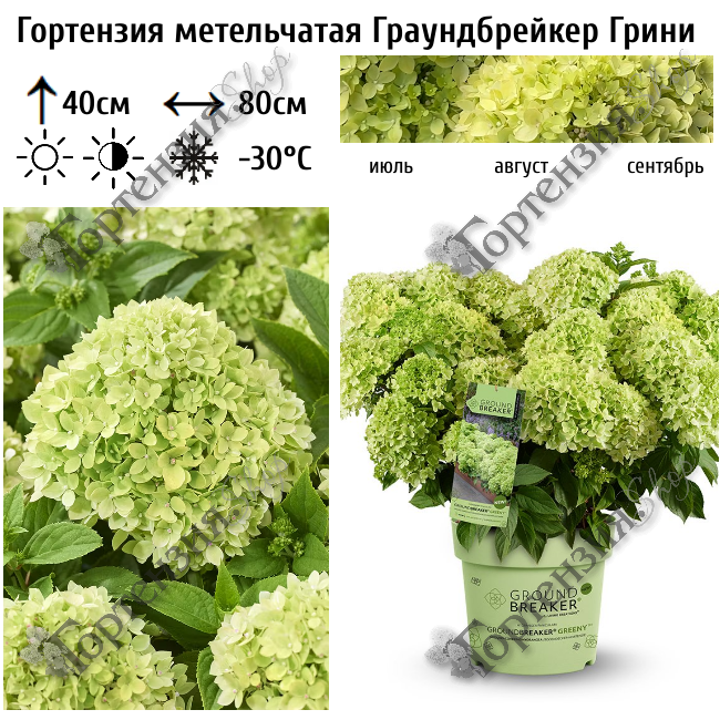Очередной шедевр от Алекса Шумейкера-гортензия метельчатая Граундбрейкер Грини (ранее был заявлен как Литтл Эпл). Сорт компактной гортензии с обильным и продолжительным цветением. Вырастает максимум до 40 см в высоту и до 80 см в ширину. С июля по октябрь покрыта привлекательными зелеными соцветиями. Цветки распускаются интенсивно зеленым цветом, постепенно становятся ярко выраженным цветом лайма, к концу цветения светлеют до размытого зеленовато-кремового. Иногда, на финише цветения могут появиться розоватые оттенки. Цветет обильно и продолжительно в стандартные сроки – с июля до конца сентября. Соцветия почти округлые, плотные, состоящие из стерильных цветков. Метелки пышные, в диаметре 15 см. Побеги прямые, самостоятельно удерживают очень крупные соцветия, куст не разваливается. Идеальный сорт для выращивания в горшках. Морозостойка.