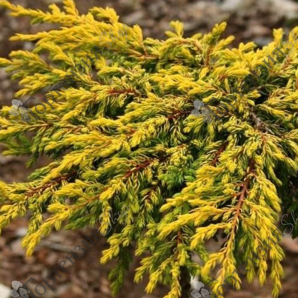 Можжевельник обыкновенный Голдшатц - почвопокровный,медленнорастущий карликовый сорт с широкой раскадистой кроной. Высота взрослого растения до 40 см и диаметром до 2,0 м.Многолетник растет медленно, прибавляя в росте не более 6--8 см в год, достигая указанных габаритов только к 10 годам. Весной хвоя оранжево-жёлтая, летом ярко-золотистая,в тени может зеленеть.Место солнечное.