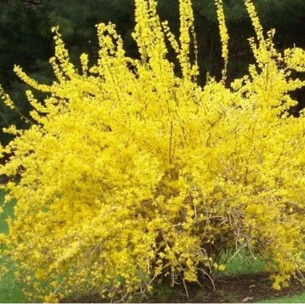 Форзиция средняя Голдзаубер (Forsythia intermedia Goldzauber) – ценится за раннее цветение, неприхотливость в выращивании и высокую декоративность. Среднерослый раскидистый кустарник с тонкими побегами высотой до 2 м. Листья длиной до 10 см, ланцетовидные, зубчатые, темно-зеленые, с нижней стороны светлее. Осенью приобретают темно-красный цвет. Цветёт крупными цветками насыщенной золотисто-жёлтой окраски апрель -  начало мая. Цветки в виде колокольчиков с 4 лепестками, ярко-желтые, располагаются кучно по 2-6 шт. на цветоножке.