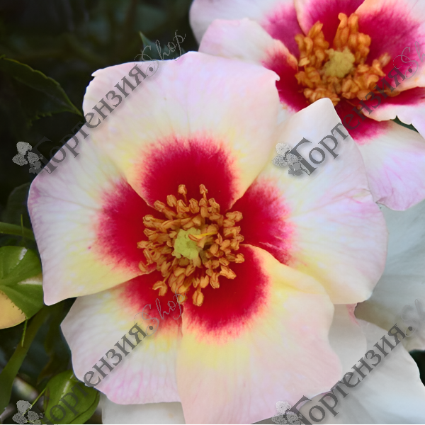 Роза миниатюрная 'Aria Babylon Eyes' (Rose miniature 'Aria Babylon Eyes') Сорт серии 'Babylon Eyes', кустарник c компактной, плотной кроной, высотой до 50 см. Листья жесткие, блестящие. Цветение обильное, продолжительное с июня по октябрь. Цветы белые с темно-розовым центром, тычинки и пестик выделяются заметно.  Они устойчивы как к жаре, так и к засухе, а также к морозам. Почвы плодородные, дренированные.