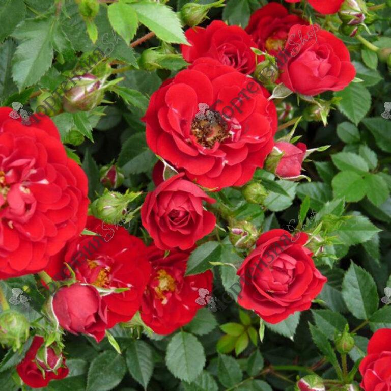 Роза миниатюрная (Rosa) 'Red Fairy' - ветвистый, широкий кустарник высотой до 60 см. Лист мелкий, со сдержанным блеском. Куст скромный по густоте, но очень нарядный. Алые, ярко-красные цветы собираются в красивые соцветия по несколько штук. На одном побеге может вырастать до 15 эффектных цветков, состоящих из 20 лепестков и желтоватой сердцевиной. Цветы, хоть и очень декоративны, источают едва уловимый аромат